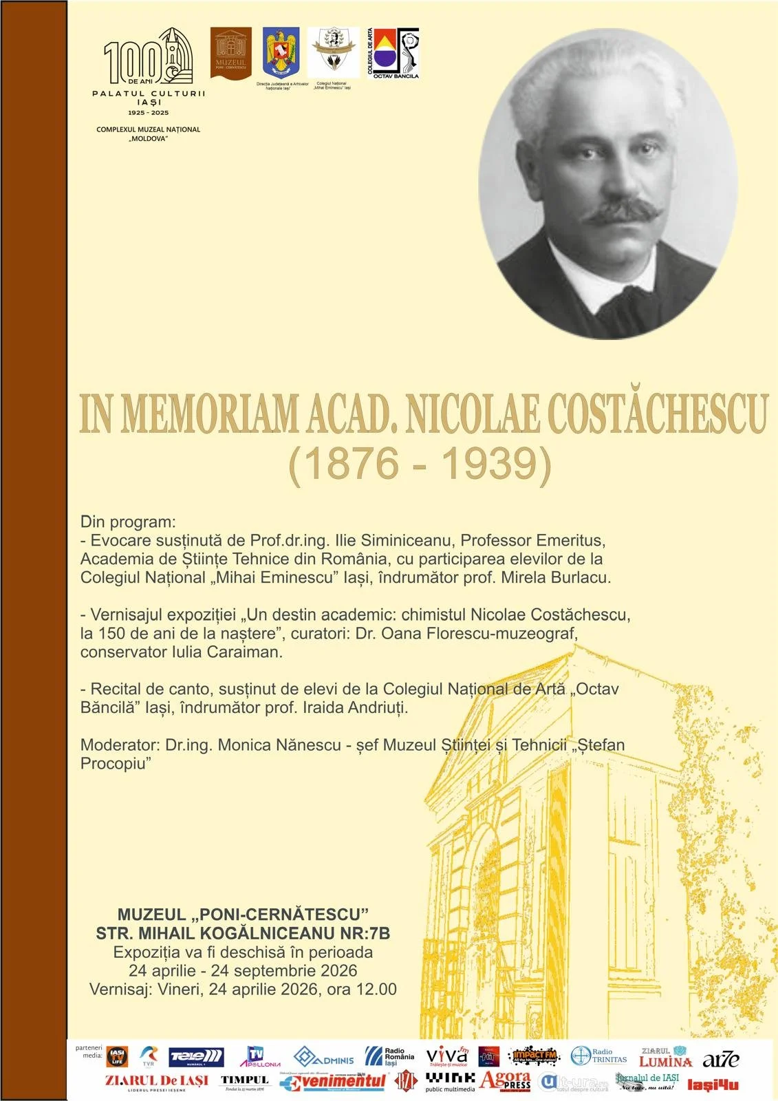 Muzeul Ştiinţei şi Tehnicii „Ştefan Procopiu” din cadrul Complexului Muzeal Naţional „Moldova” Iaşi organizează vineri, 24 aprilie 2026, începând cu ora 12.00, la Muzeul „Poni - Cernătescu” (str. Mihail Kogălniceanu, nr. 7B), manifestarea omagială „IN MEMORIAM NICOLAE COSTĂCHESCU”.