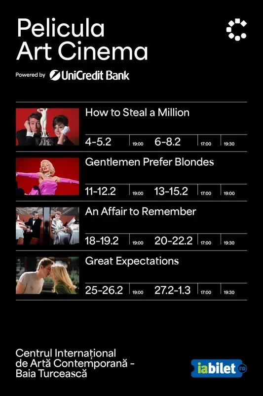 La Pelicula Art Cinema, în luna februarie, puteți vedea mai multe proiecții a patru filme clasice: „How to Steel a Million”, „Gentlemen prefer Blondes”, „An Affair to Remember” și „Great Expectations”. Se vor difuza la Centrul Internațional de Artă Contemporană - Baia Turcească.