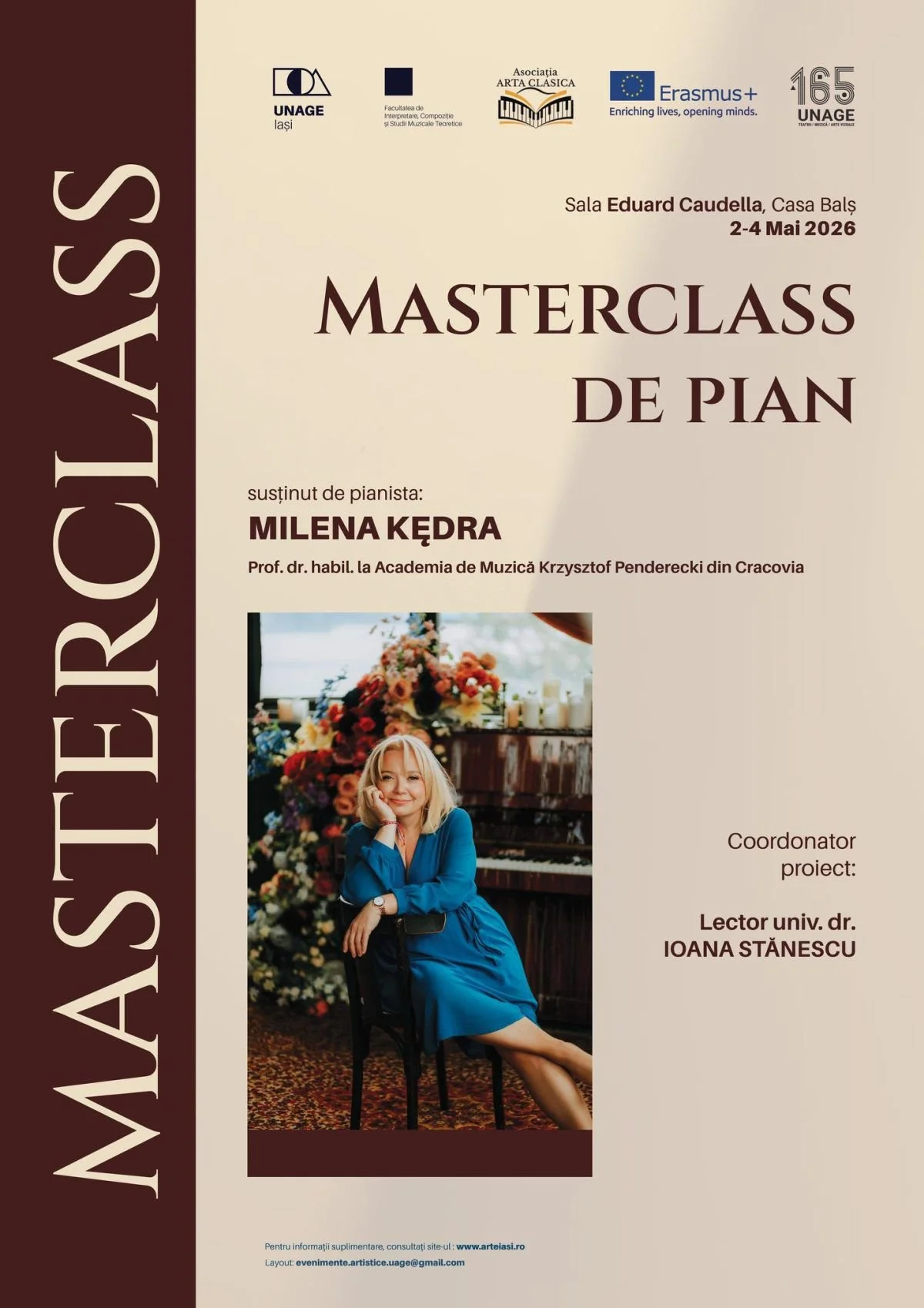 Facultatea de Interpretare, Compoziție și Studii Muzicale Teoretice din cadrul UNAGE Iași, organizează în perioada 2-4 Mai 2026, în sala „Eduard Caudella”, un Masterclass internațional de pian, susținut de pianista Milena Kędra din Polonia.