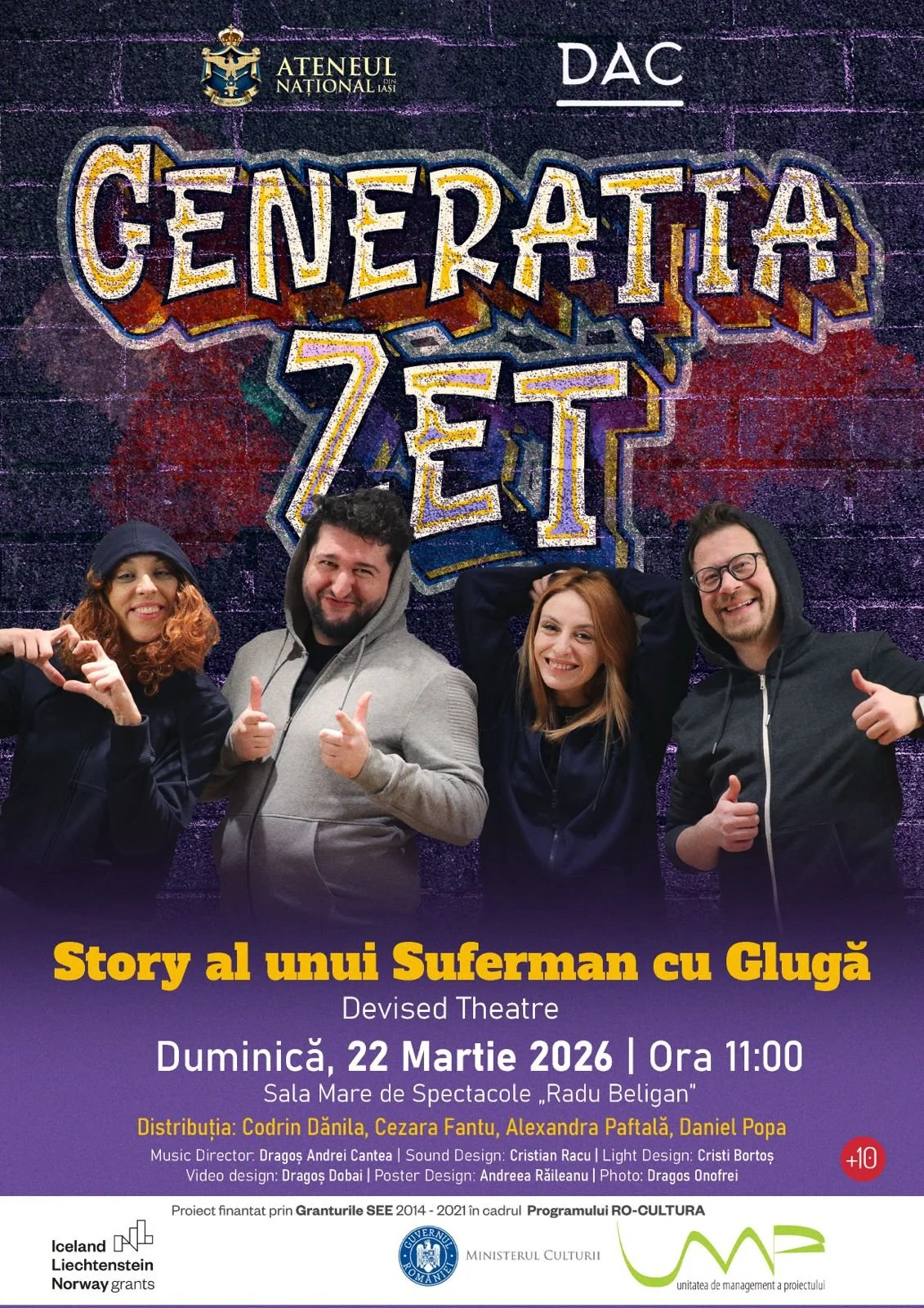Ateneul Național din Iași vă invită duminică, 22 martie, ora 11.00 la spectacol de teatru: Generația ZET | Povestea unui Suferman cu Glugă | Devised Theatre, la Sala Mare de Spectacole „Radu Beligan”.