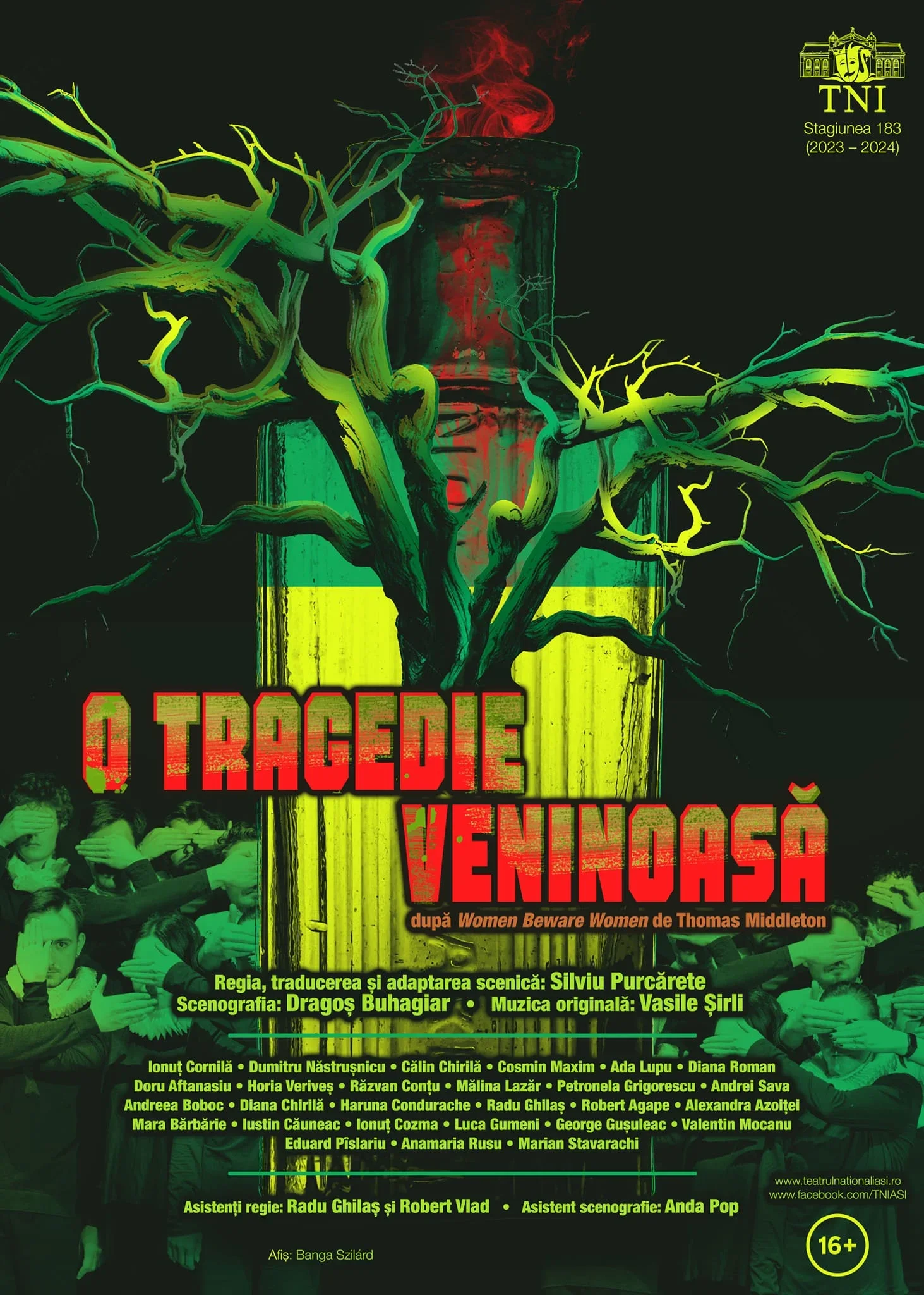 Dramaturgul și poetul elisabetan Thomas Middleton (1580-1627), montat acum pentru prima dată în România, a fost unul dintre cei mai prolifici autori englezi ai secolului al XVII-lea, fiind supranumit de criticii britanici „celălalt Shakespeare al nostru”. De altfel, Middleton a colaborat cu Shakespeare la scrierea unor scene din Timon din Atena, iar după moartea acestuia, Middleton a fost singurul autor căruia Compania Shakespeare i-a încredințat piesele shakespeariene pentru a le adapta. Cele mai de succes tragedii ale sale sunt „The Changeling” și „Women Beware Women” (O tragedie veninoasă), publicată pentru prima dată în 1657. Piesa lui Thomas Middleton, montată de Silviu Purcărete, expune o lume lipsită de moralitate, devorată de ipocrizie, răzbunare și manipulare, de pofte trupești și de înavuțire; o tragedie condimentată cu accente comice, care reușește să ofere o portretizare exactă a unei societăți vechi de sute de ani, oglindă perfectă a lumii de astăzi.Ada Lupu (în rolul Liviei): „Pentru mine este o mare bucurie și o provocare să lucrez la acest rol de compoziție. Repetițiile cu Silviu Purcărete sunt ca un continuu moment de grație, iar pentru încrederea pe care mi-a acordat-o oferindu-mi acest rol și generozitatea cu care m-a ajutat să construiesc personajul, îi sunt profund recunoscătoare. Cred foarte mult în acest spectacol.”Mălina Lazăr (în rolul Biancăi): „Privilegiul de a lucra cu Silviu Purcărete a produs, fără îndoială, frământări esențiale în procesul meu de lucru ca actriță. Fie ca îmi amintesc de Bufonul din Antonin Artaud. Familia Cenci, fie ca mă gândesc la Bianca din O tragedie veninoasă, simt că personajele atât de migălos conturate de Silviu Purcărete mă poartă alături de ele spre înțelegerea unor lumi noi, a unor universuri complexe, dar intrigante, și spre probarea unor noi modalități de expresie artistică.”Răzvan Conțu (în rolul lui Leantio): „Sunt profund recunoscător pentru întâlnirea cu regizorul Silviu Purcărete. Lumea spectaculară pe care domnia sa o propune este fascinantă și m-a hipnotizat încă de pe vremea când eram licean și veneam la Iași să văd spectacole precum Cafeneaua și Pălăria florentină. Ca tânăr actor la început de drum, este o șansă uriașă să lucrezi cu un regizor de o așa imensă generozitate artistică. În aceeași măsură, sunt entuziasmat de faptul că acest spectacol este rodul muncii unor oameni de teatru deosebiți, cu care îmi doream să mă întâlnesc ca artist, și anume scenograful Dragoș Buhagiar și compozitorul Vasile Șirli. Repetițiile au însemnat pentru mine un izvor de cunoaștere. De la momentul zero al repetițiilor și până în ziua premierei, am simțit că toată echipa (colegii mei de scenă, cât și cei care din afara scenei investesc multă muncă) a fost acaparată de o atmosferă specifică a unei lumi atipice, care a servit căutărilor noastre artistice. Personajele create de Thomas Middleton au un destin tragic și trăiesc cu patimă. De pildă, personajul Leantio, care după o viață nu tocmai ușoară, se îndrăgostește ca printr-un vis de Bianca. Iar ca printr-un coșmar, o și pierde. Există multă substanță și profunzime în această partitură actoricească. Iar pentru a înțelege limpede patima cu care-și trăiește viața Leantio, am urmărit să găsesc în sufletul meu cele mai pure sentimente dar, totodată, și cele mai întunecate.”„O tragedie veninoasă”, cel de-al șaselea proiect al regizorului Silviu Purcărete lansat pe scena Naționalului ieșean, vine la scurt timp după montarea de succes „Antonin Artaud. Familia Cenci”, producție care a primit nu mai puțin de trei nominalizări la Gala Premiilor UNITER 2023: „Cel mai bun spectacol”, „Cea mai bună scenografie – Dragoș Buhagiar”, „Cea mai bună actriță în rol secundar – Ada Lupu”. În 2022, la cea de-a 30-a ediţie a Galei Premiilor UNITER 2022, un alt proiect al Naționalului ieșean, „Plugarul și Moartea” de Johannes von Tepl, este desemnat „Cel mai bun spectacol al anului”, recunoaștere la care se adaugă și Premiul pentru creativitatea video design-ului și mapping-ului, oferit lui Andrei Cozlac. În același an, la Festivalul Internațional de Teatru „Theater at the Crossroads” din Serbia, producția și-a îmbogățit palmaresul cu alte patru premii: „Cel mai bun spectacol”, „Cea mai bună scenografie” (Dragoș Buhagiar), „Cel mai bun video design” (Andrei Cozlac) și „Cel mai bun rol masculin” (Călin Chirilă).