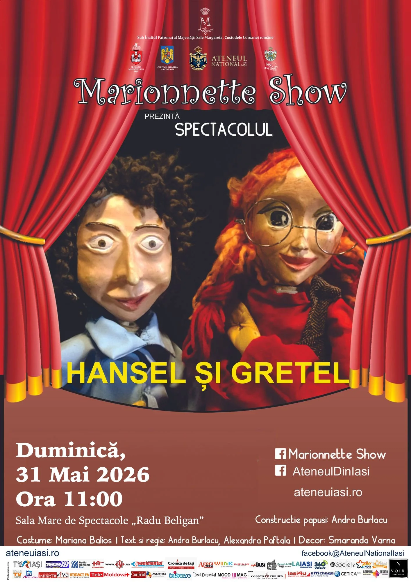 Frățiorii Hansel și Gretel pornesc duminică, 31 mai, ora 11.00, în Sala Mare de Spectacole „Radu Beligan”, într-o aventură pe cinste! Vor face cunoștință cu o vrăjitoare hazlie, vor râvni la căsuța de turtă dulce…și vom descoperi împreună cu cine se vor mai întâlni cei doi!